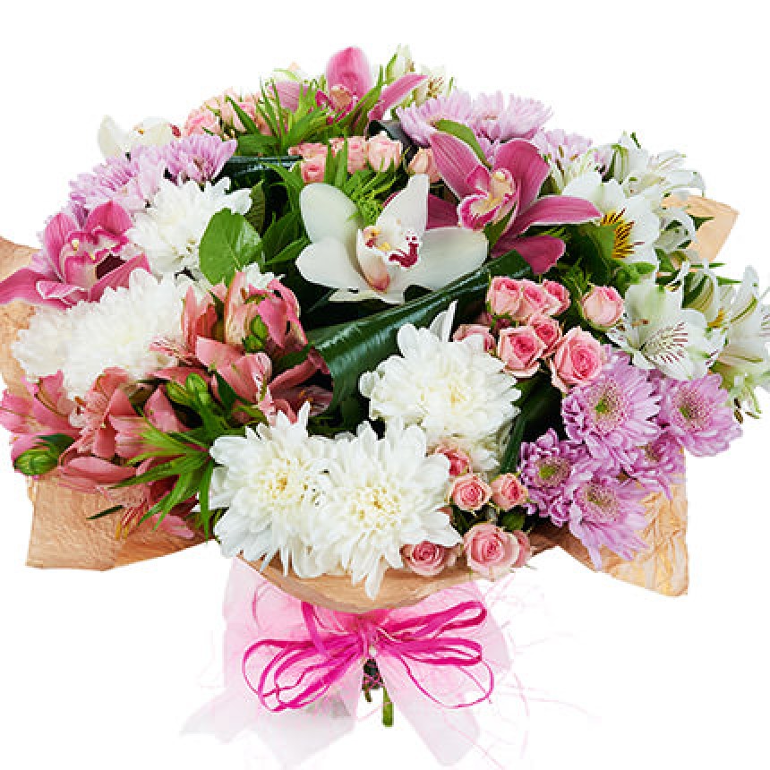 3 цветка орхидеи, 5 веток разноцветных хризантем, 5 разноцветные альстромерии, 4 ветки разноцветной кустовой розы, зелень, оформление.