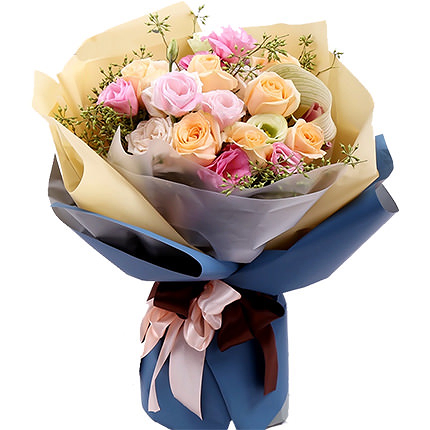 7 кремовых роз, 6 веток белой и розовой эустомы, зелень и оформление может отличаться.