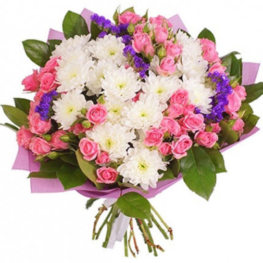 3 веток белой ромашковой хризантемы, 8 веток кустовой розовой розы, полевые цветы, зелень, оформление.
