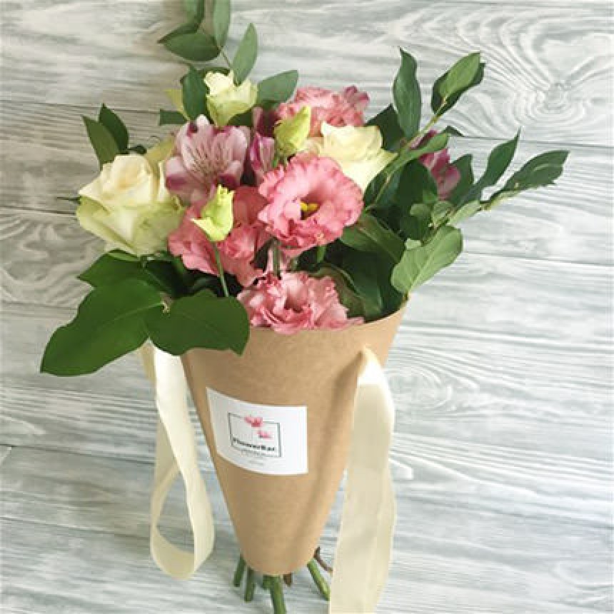 5 белых роз, 4 ветки розовой эустомы, 2 альстромерии, зелень, специальное оформление.