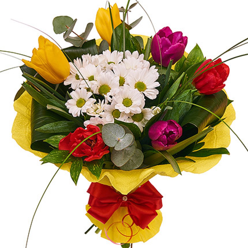 Описание букета: Яркий солнечный букет весенних тюльпанови хризантемыподнимет настроение Вашему получателю! Состав букета: 6 разноцветных тюльпанов, ветка ромашковой хризантемы, зелень, оформление. (В случае отсутствия в наличии тюльпанов данного цвета их цвет может быть заменен.)