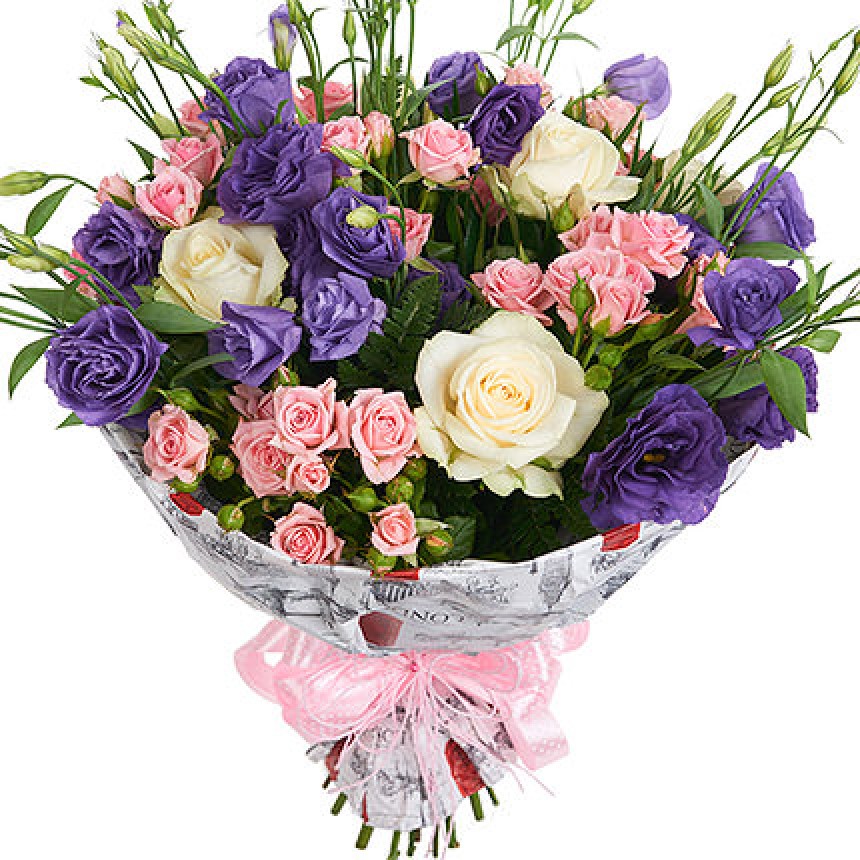 5 белых роз, 5 веток розовой кустовой розы, 7 веток эустомы, зелень, оформление может отличаться.