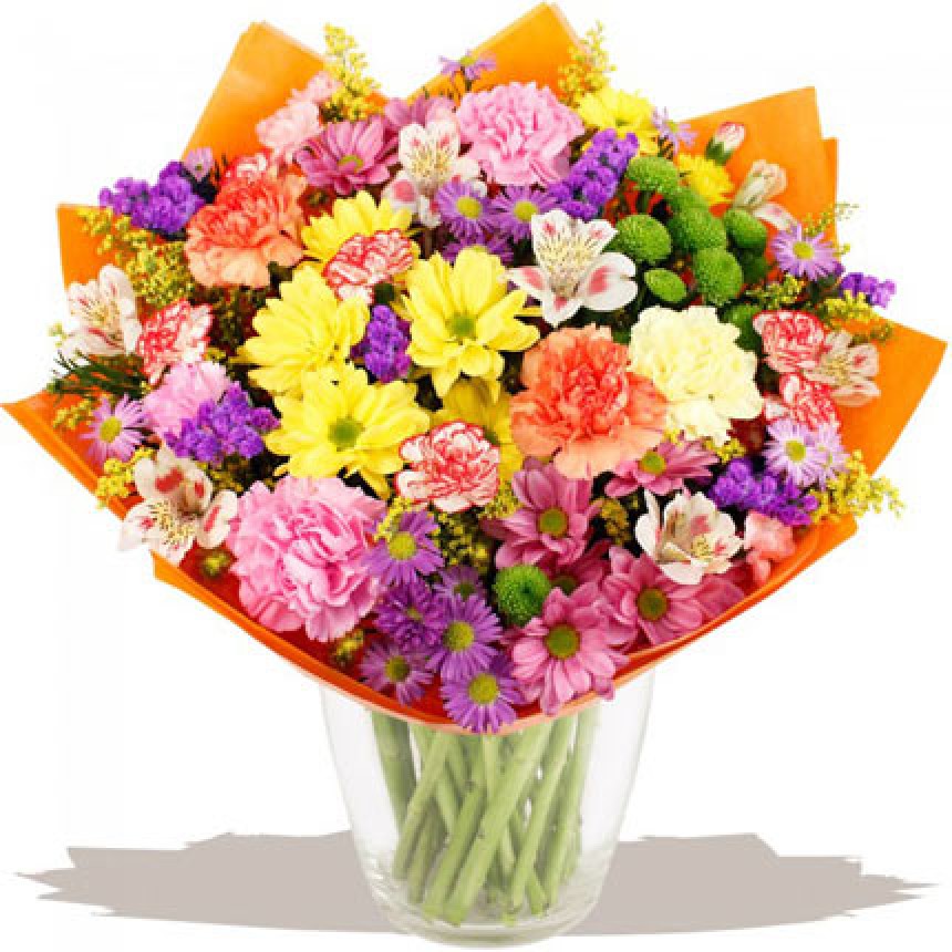 Описание букета: Красочный букет из ярких альстромерий и хризантем - чудесный подарок к празднику. Состав: 7 веток ромашковой хризантемы, 7 гвоздик, 5 веток статици (Статица является сезонным цветком, при отсутствии может заменяться хризантемой), альстромерия, зелень, оформление может отличаться.