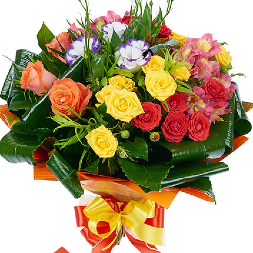 Описание букета: Радуйте любимых просто так и создавайте в их жизни как можно больше приятных и ярких моментов, ведь так здорово, когда есть что вспомнить! Состав: 5 веток разноцветной кустовой розы, 3 коралловые розы, альстромерии, эустома, зелень, оформление.
