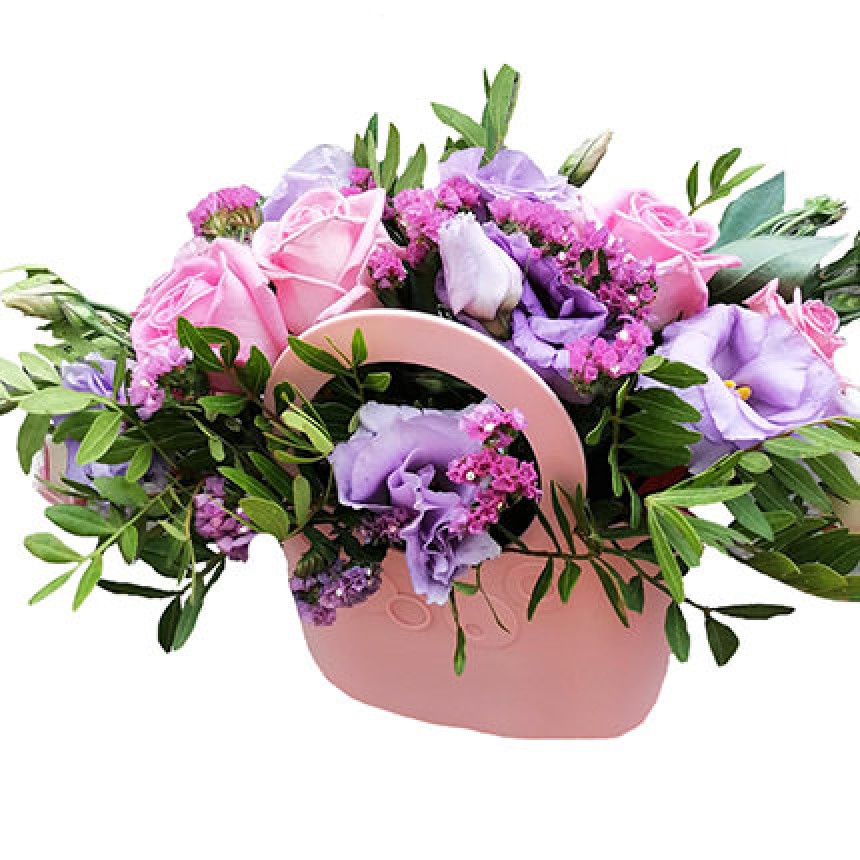 Описание букета: Для такого чудесного презента совсем не нужно ждать особенного повода - поднимите настроение близкому человеку просто так! Состав: 5 розовых роз, 3 ветки разноцветной эустомы, статица, зелень, декоративное кашпо,флористический материал.