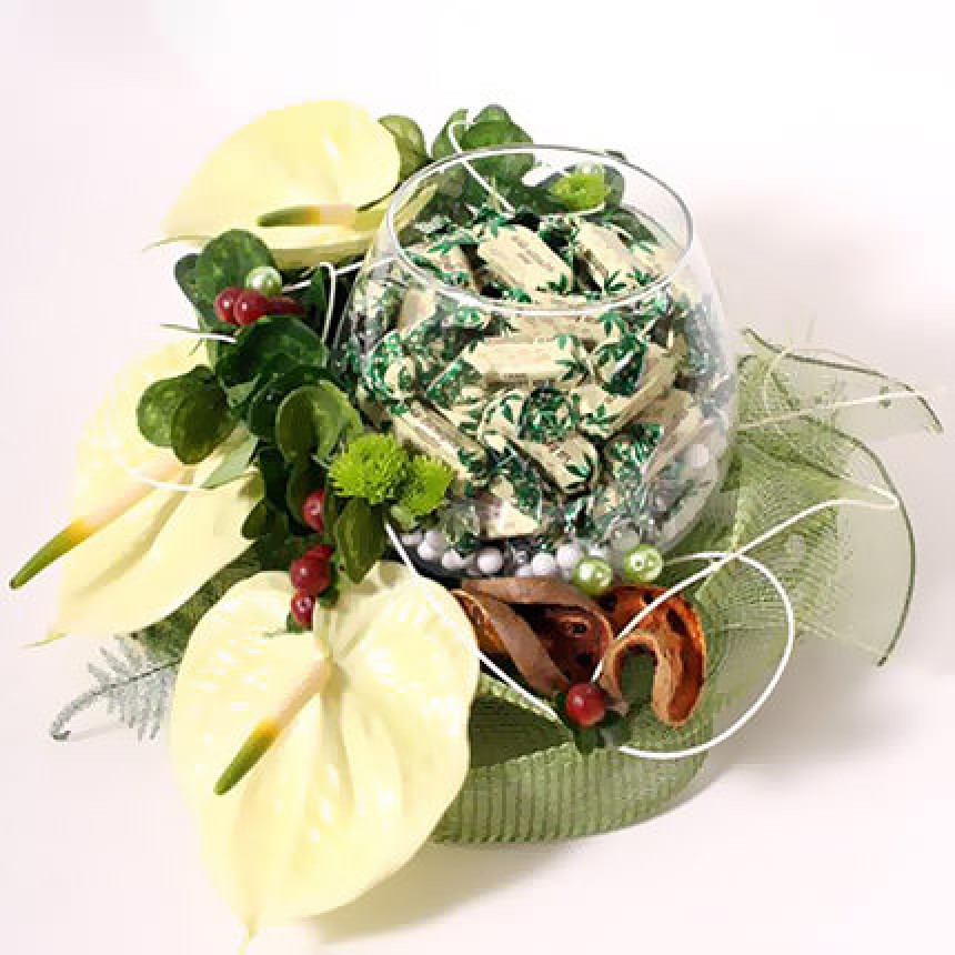 Описание композиции: Проявить гостеприимность очень просто!Разместив такую композицию в холле Вы побалуете своих посетителей, а необычное оформление конфетницы подчеркнет Вашу креативность и несомнено произведет позитивное впечатление. Ведь успех дела зависит даже от мелочей! Состав: 3 антуриума, ветки зеленой хризантемы сантини, зелень, флористический материал, ваза (Ваза включена в стоимость букета. Ваза может быть заменена на однотипную, в случае отсутствия данной модели на складе. Конфеты не включены в стоимость композиции.).