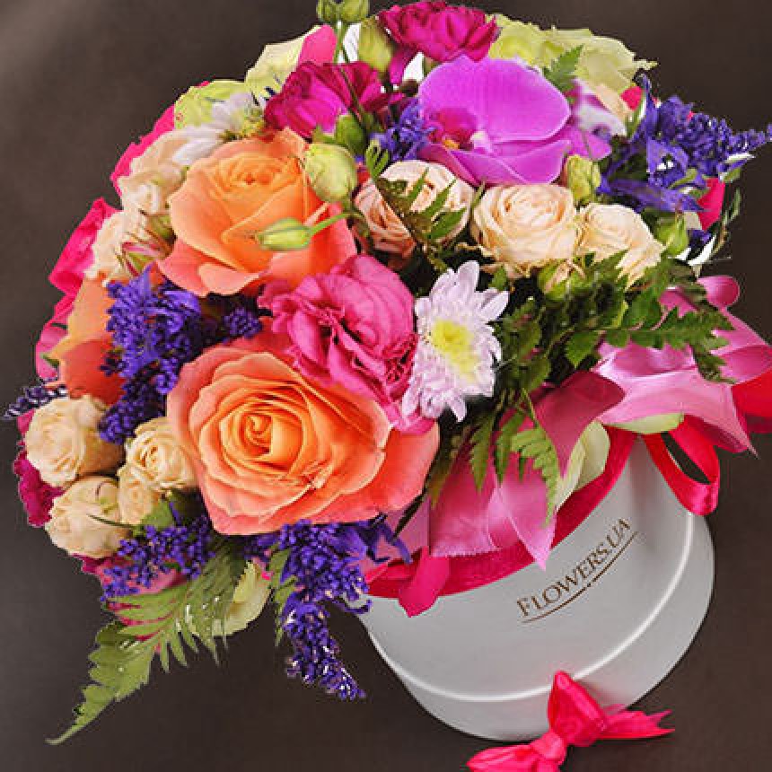 цветок орхидеи, 8 розовых и оранжевых роз, 7 веток кустовой кремовой и розовой розы, 2 ветки нежной эустомы, ветка хризантемы, зелень, декоративная коробка, флористический материал.