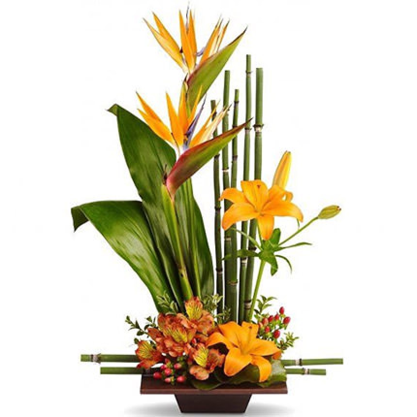 Описание композиции: Экзотическая композиция станет замечательным украшением приёмной в Вашем офисе, ведь стиль создается из мелких деталей! Состав: 2 стрелиции, 4 бамбука, 1 лилия, альстромерии, гиперикум, листья аспедистры, флористический материал.
