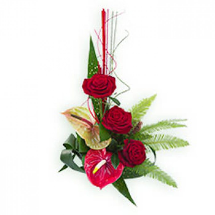 Описание композиции: Путь к успеху тернист? - Нет, Ваш путь будет легок и крайне удачен! Главное настрой и также гармоничная, приятная обстановка, а композиция из роз и антуриумов станет стильным акцентом в Вашем интерьере. Состав: 3 красные розы, 3 антуриума, зелень, флористический материал.