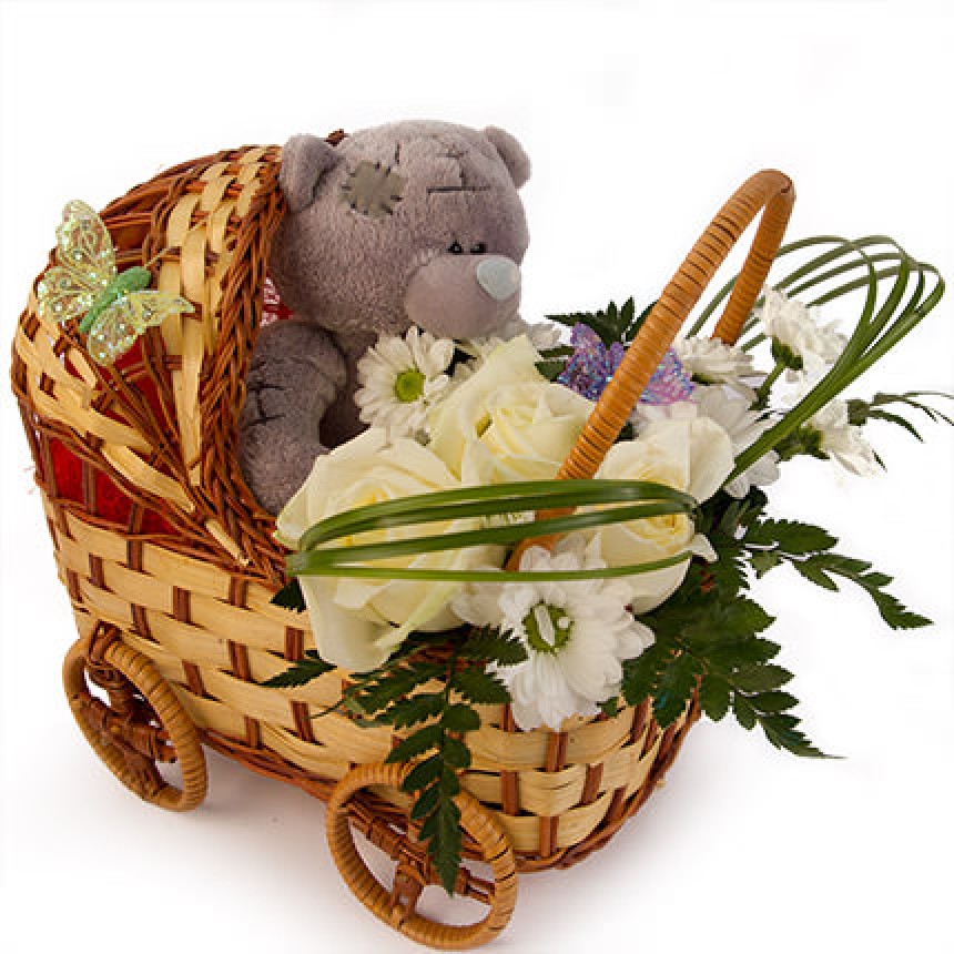 Описание композиции: Хотите быть оригинальными в выборе подарка для новорожденного? С такой композицией восторг получателей Вам гарантирован! Состав: мягкая игрушка Мишка, 3 белые розы, ромашковая хризантема, зелень, корзина в форме коляски. (Корзина может быть заменена на однотипную, в случае отсутствия данной модели на складе.)