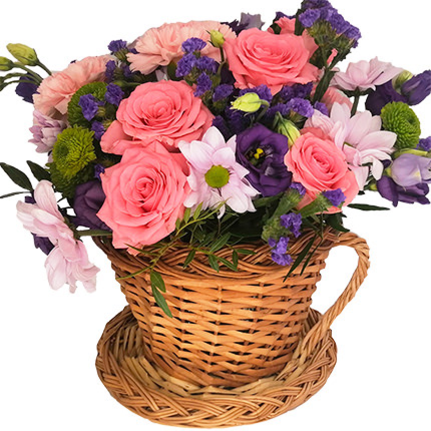 Описание букета: Нежная композиция удивит своей оригинальностью и запомнится Вашему получателю на долгое время! Состав: 7 розовых роз, 3 гвоздики, 2 ветки хризантемы, 2 ветки эустомы, статица, зелень, декоративная чашка,флористический материал. (Чашка в ассортименте. Чашка может быть заменена на однотипную, в случае отсутствия данной модели на складе. Цвет чашки и букета, а так же состав букета могут быть изменены по Вашему желанию. Для уточнения замены свяжитесь, пожалуйста, с менеджером.)