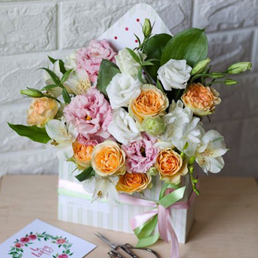 3 ветки кустовой кремовой розы, 2 ветки эустомы, 2 ветки альстромерии, зелень, декоративное кашпо, флористический материал.