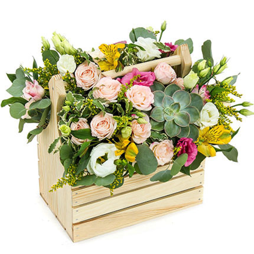Описание композиции: Летний презент для нежной и милой - для самой любимой! Состав композиции: суккулент, 7 веток белой и розовой эустомы, 6 веток кремовой кустовой розы, 3 альстромерии, солидаго, эвкалипт, зелень, декоративное кашпо, флористический материал.