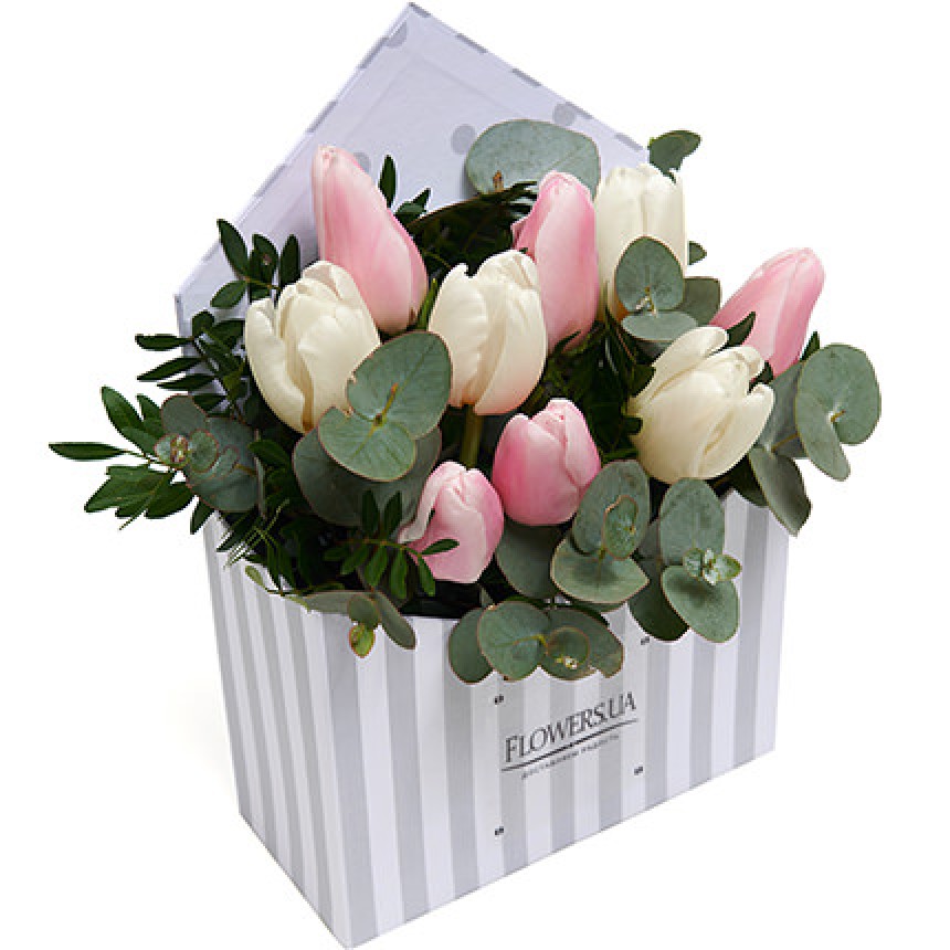 9 белых и розовых тюльпанов, зелень, декоративное кашпо, флористический материал.