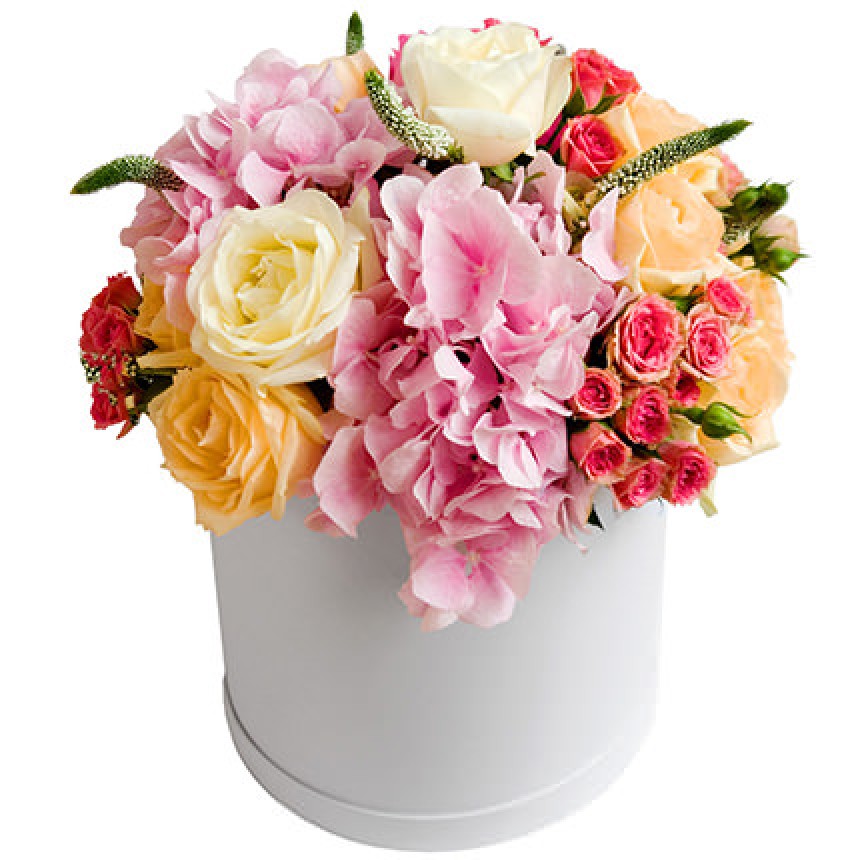 Описание композиции: Очень трогательная композиция напоминает нежные и теплые объятия дорогой и горяче любимой! Поспешите передать самые важные и приятные слова в этот замечательный день! Состав композиции: гортензия, 15 белых и кремовых роз, 5 веток розовой кустовой розы, зелень, декоративная коробка, флористический материал.