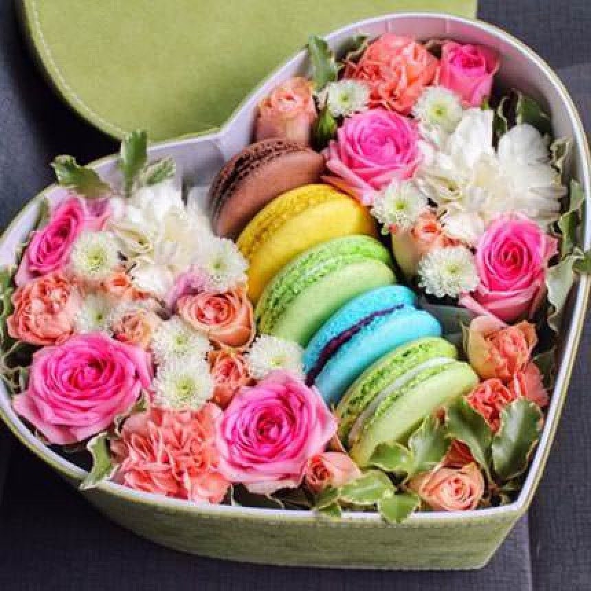 Описание композиции: Нежная композиция для единственной, милой и такой любимой! Не стоит ждать знаменательной даты, порадуйте любимую сегодня! Состав композиции: печенье Macaron - 5 шт., 6 розовых роз, 5 гвоздик, 2 ветки кустовой розовой розы, ветка белой ромашковой хризантемы, зелень, декоративная коробка в форме сердца, флористический материал.