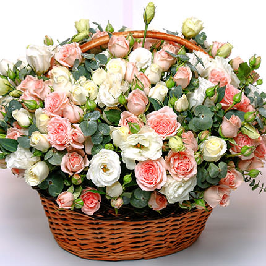 40 веток белой и розовой кустовой розы, 11 веток белой эустомы, эвкалипт, корзина, оформление.