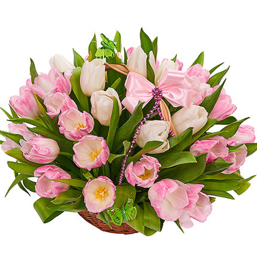 29 розовых и белых тюльпанов, корзина.(Корзина может быть заменена на однотипную, в случае отсутствия данной модели на складе.)