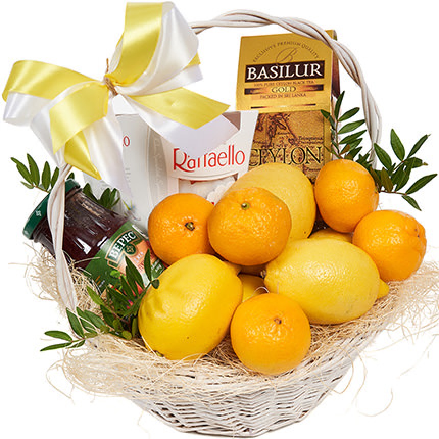 Описание корзины: Безусловный хит этой зимы! Поздравления могут быть не только красивые, но еще и максимально полезные! Состав корзины:коробка конфет "Raffaello"- 150 гр., баночка джема, пачка чая, 8 мандарин (в период не сезона лето-осень могут быть заменены нектаринами или персиками), 5 лимонов, декор, корзина. (Корзина доставляется в прозрачной целлофановой упаковке.) Вес корзины: до 4-5 кг.