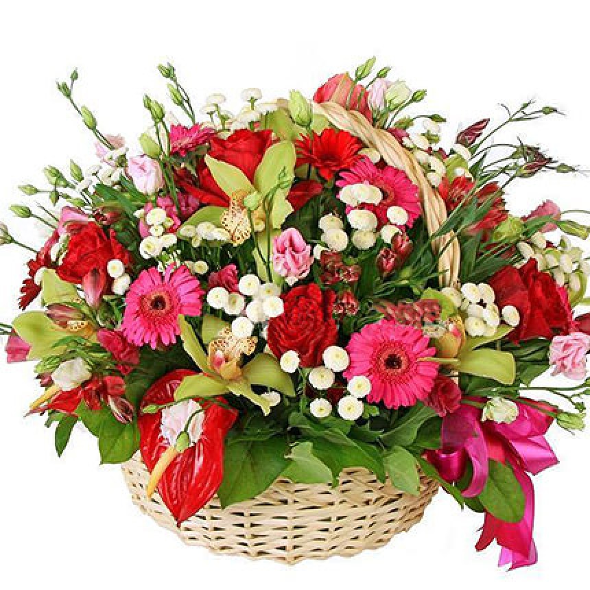 Описание корзины: Яркая корзина поразит Вашего получателя изобилием цветов. В ней можно найти все от экзотического антуриума до королевы цветов - розы! Состав: антуриум, 7 красных роз, 7 гербер (Чтобы уточнить наличие гербер свяжитесь, пожалуйста, с нашим менеджером. Гербера является сезонным цветком, при отсутствии может заменяться хризантемой.), 6 цветков орхидеи, 8 веток белой хризантемы сантини, 10 эустом, альстромерия, зелень, корзина, флористический материал, оформление.