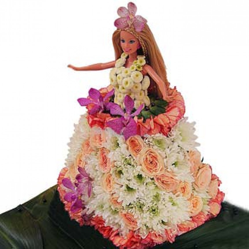 40 кремовых роз, 10 веток белой ромашковой хризантемы, ветка орхидеи, кукла, зелень, флористический материал.