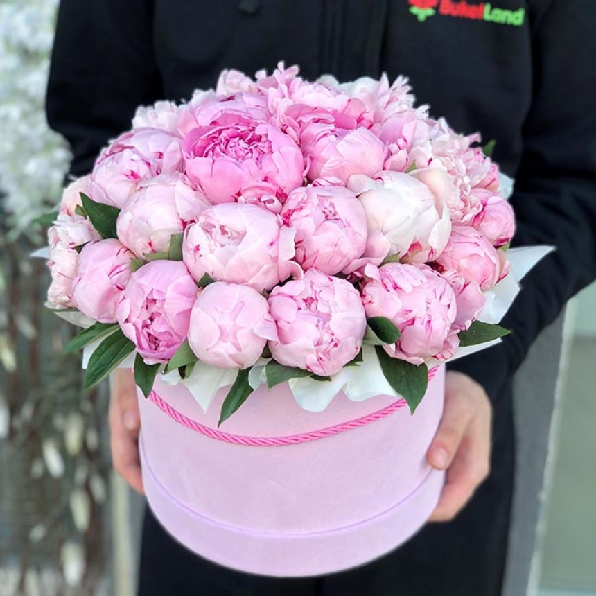 29 пионов в шляпной коробке. Выбирайте и заказывайте 29 пионов в шляпной коробке с доставкой в Киеве и по всей Украине с интернет магазином цвтов и подарков azalya.