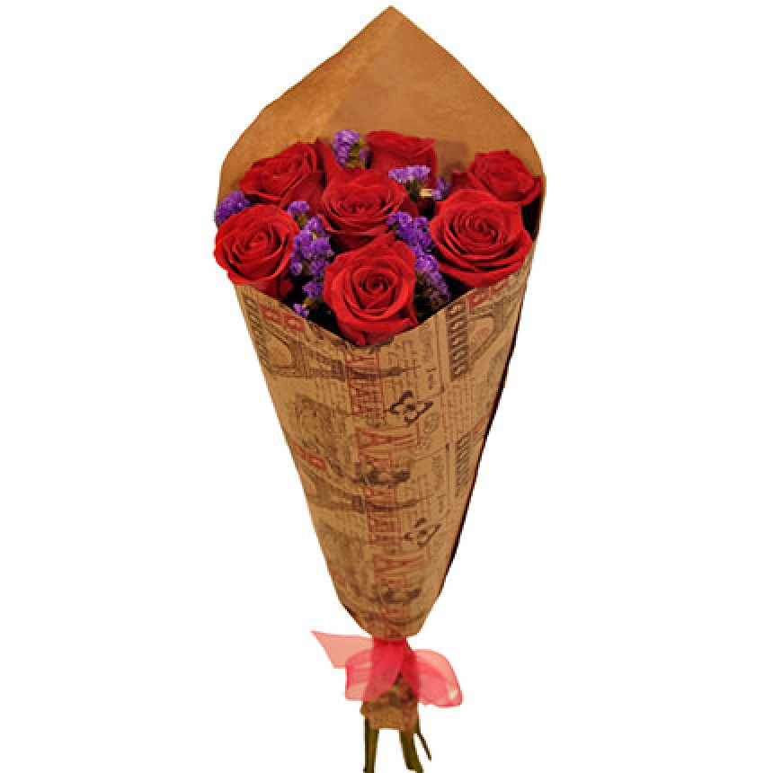 Описание букета: Оригинальное сочетание красных роз и фиолетовой статицы делает этот букет особенно запоминающимся!Состав: 7 красных роз, статица, оформление может отличаться.