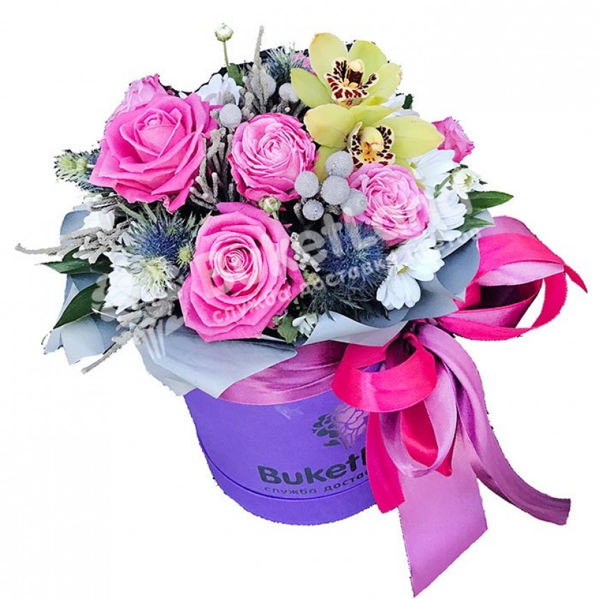 Букеты,Варианты композиций,Цветы в шляпной коробке Цветы в шляпной коробке «Очарование» 5002