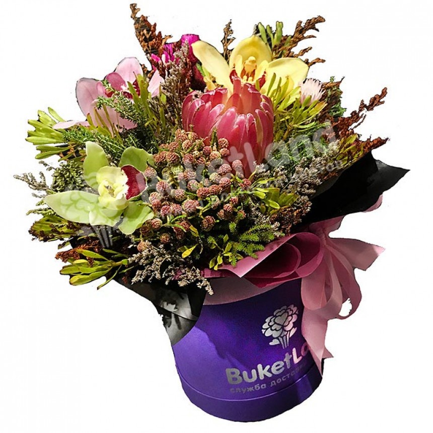 Букеты,Варианты композиций,Цветы в шляпной коробке Цветы в шляпной коробке «Сокровище» 4910