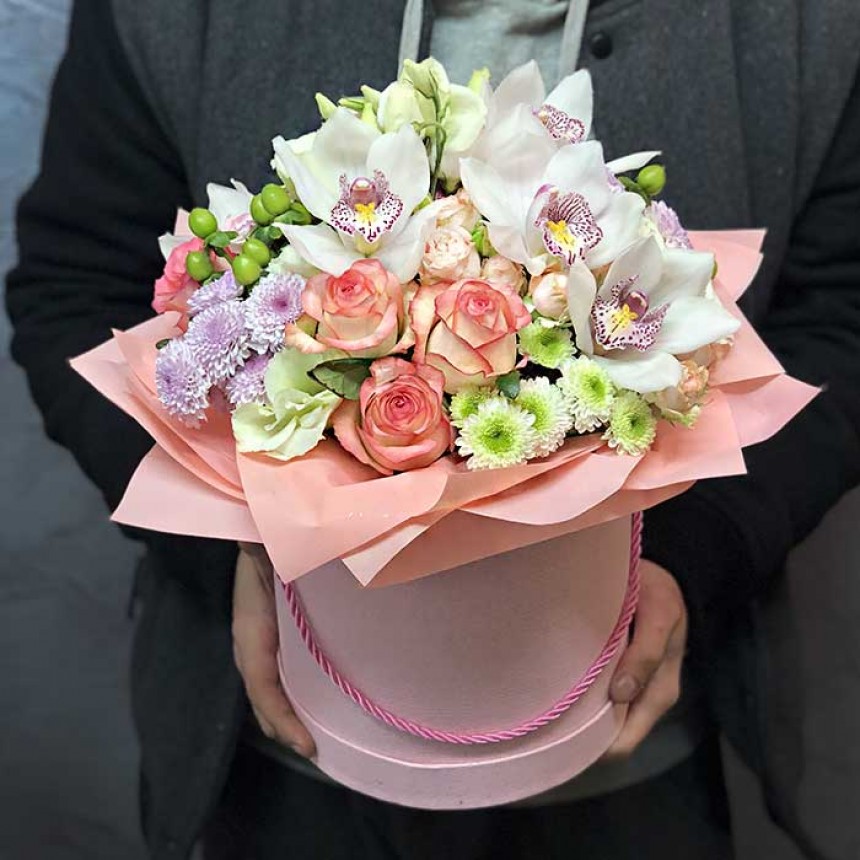 Букеты,Варианты композиций,Цветы в шляпной коробке Цветы в шляпной коробке «Время любить» 4904