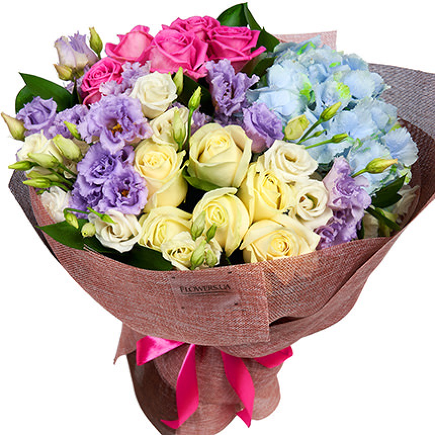 гортензия, 11 розовых и белых роз, 5 веток белой и фиолетовой эустомы, зелень, оформление.