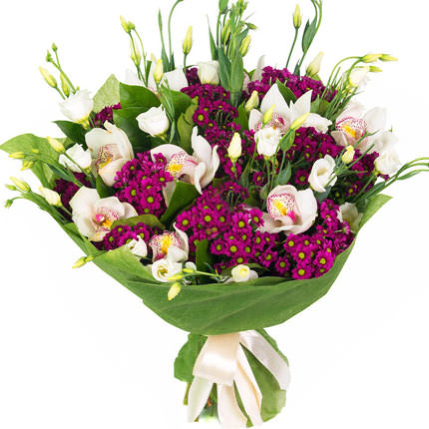 7 цветков орхидеи, 10 веток нежной эустомы, 10 веток бордовой ромашковой хризантемы, зелень, оформление.