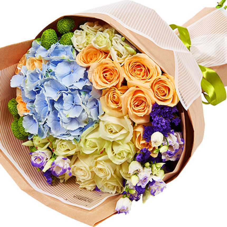 гортензия, 21 белая и кремовая роза, 3 ветки белой и фиолетовой эустомы, 2 зеленые хризантемы, оформление.