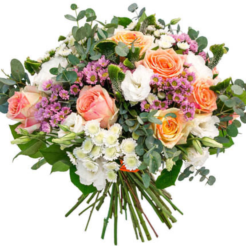 9 роз, 7 веток белой и розовой ромашковой хризантемы, 7 веток эустомы, зелень, оформление.
