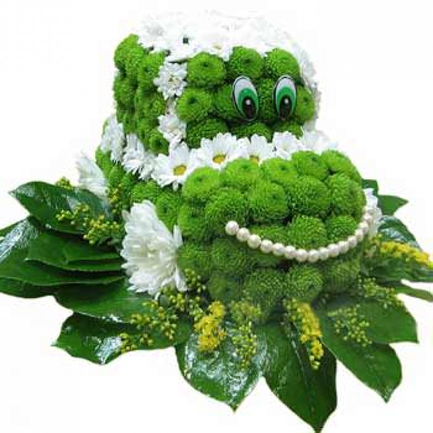 Описание композиции: Для настоящих автолюбителей! Такой подарок будет уместен к любому торжеству, а преподнести его актуально для женщины, мужчины и даже маленького ребенка! Состав композиции: 12 веток зеленой хризантемы сантини, 5 веток белой ромашковой хризантемы, зелень, флористический материал.