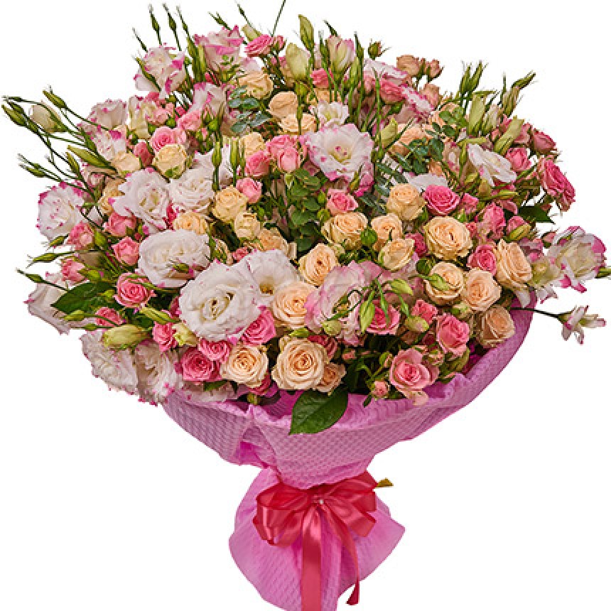 15 веток белой эустомы, 20 веток розовой и кремовой кустовой розы, зелень, оформление.