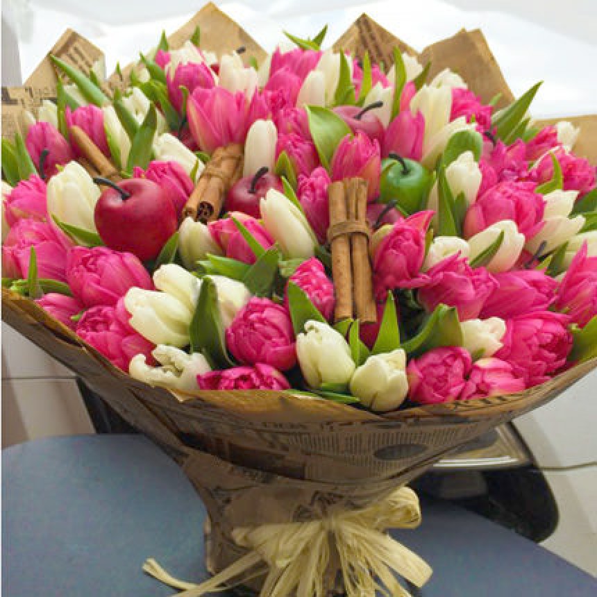 151 розовый и белый тюльпан, палочки корицы, декоративные яблоки, оформление.