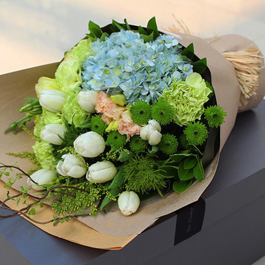 гортензия, 9 белых тюльпанов, 8 гвоздик, 2 ветки зеленой хризантемы сантини, хризантема зеленая, 2 ветки эустомы, зелень, оформление.