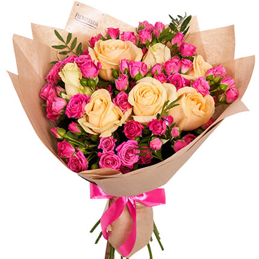 Шикарное сочетание нежных кремовых роз, кустовых розовых роз и оригинальной упаковки подарит получателю положительные эмоции и надолго запечатлится в памяти! Делайте незабываемые подарки любимым!