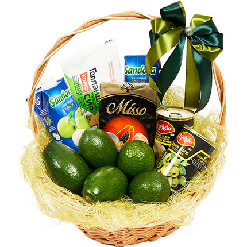 авокадо - 5 шт., сыр - 1 пачка, оливки - 2 баночки, орешки (микс) - 1 пачка, сок 0,5 литра - 2 шт. (сок в ассортименте), корзина, декор. (Подарочная корзина доставляется в прозрачной целлофановой упаковке.)