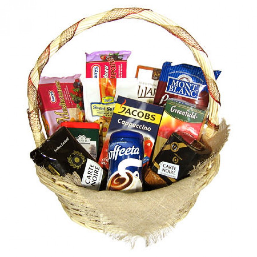 Что может быть лучше, чем беседа за чашечкой ароматного чая или кофе? Подарите истинную радость ценителям чаепития в хорошей компании. Состав: кофе Carte Noire, чай (Greenfield), Капучино, сухие сливки Coffetta, 2 бисквитных рулета, печенье и шоколад.