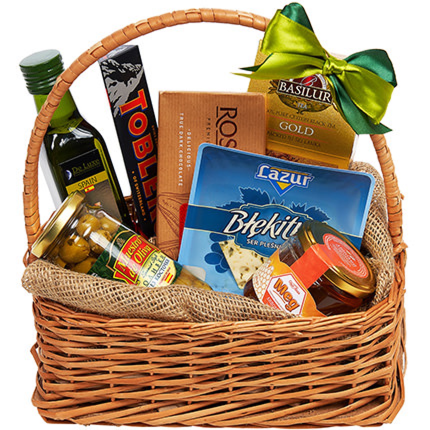 Описание корзины: Такое приятное и неожиданное приглашение к романтическому вечеру не оставит равнодушной ни одну представительницу прекрасного пола. Состав корзины:шоколад "Toblerone", шоколад "Roshen"- (в ассортименте), пачка чая "Basilur", сыр с плесенью - 100 гр., баночка оливок - 300 мл., баночка меда - 300 гр., баночка оливкового масла - 250 гр., корзина, флористический материал. (Корзина доставляется в прозрачной целлофановой упаковке.)