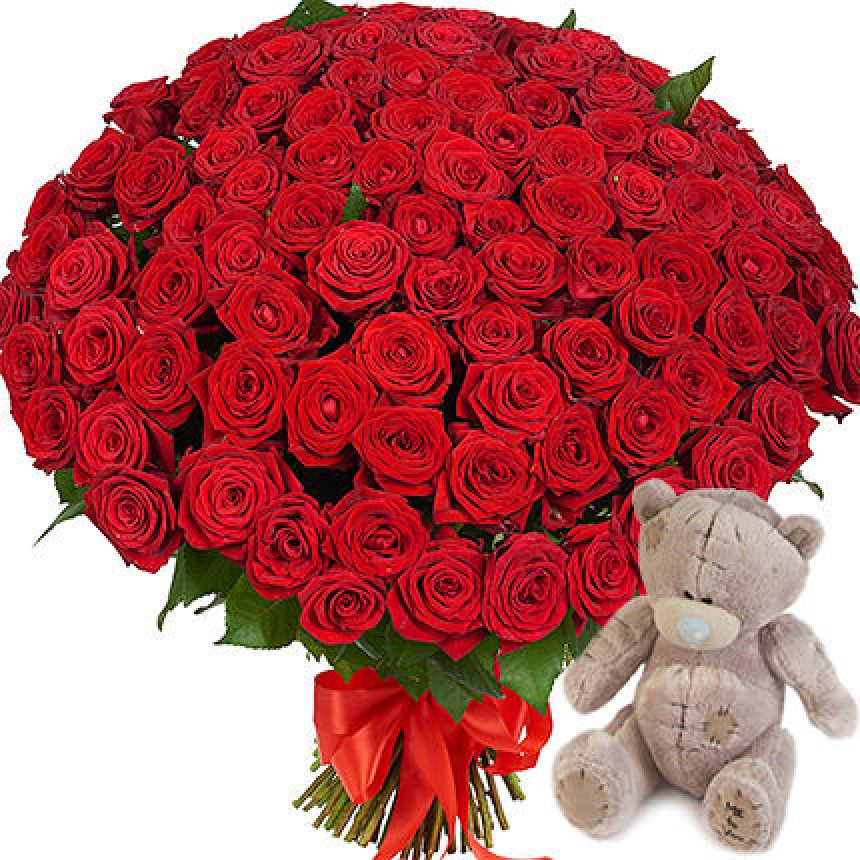 Опис букета: Червона троянда завжди в моді! А така хмара червоних троянд - чудовий подарунок для неї! Склад: 101 червона троянда. Акція! М'яка іграшка ведмедик у подарунок.