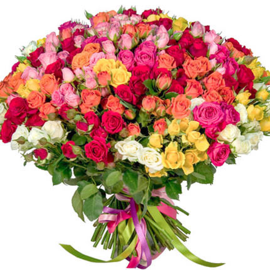 Опис букета:Подаруйте справжній феєрверк почуттів з яскравих кущових троянд - здивуйте улюблену!Склад: 101 гілка різнокольорової кущової троянди.