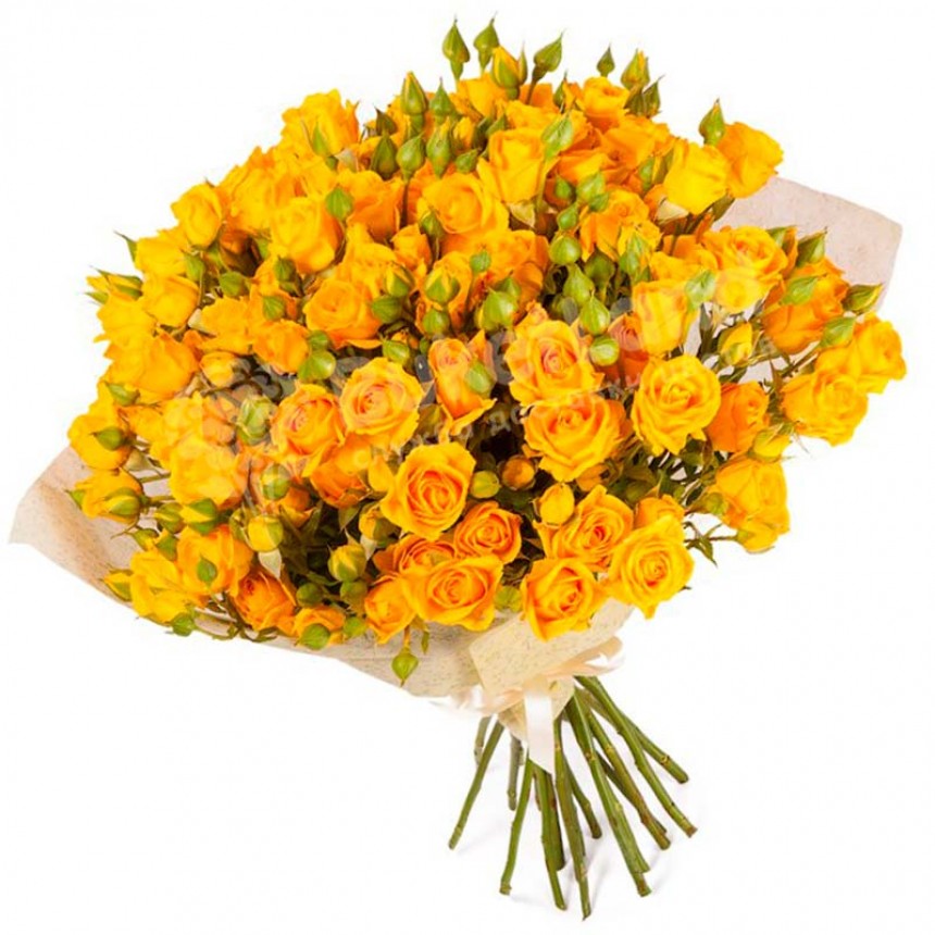 Великий букет, у якому півсферою зібрано красиву 31 жовту троянду спрей, – оригінальний подарунок для коханої. Яскраві бутони без шипів, зібрані в пензлі, насиченого жовтого відтінку обов'язково піднімуть настрій. Ширина великого сонячного букета досягає 30 см, довжина троянди – 50–60 см. Для оформлення використовують класичну обгортку нейтрального кольору. дивовижне поєднання викликає захоплення та щиру радість!