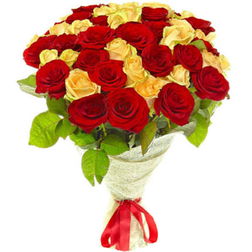 Опис букета: Контрастний букет з троянд у теплій кольоровій гамі висловить Вашу ніжність і передасть теплі почуття дорогій людині! Склад: 51 червона та кремова троянда, оформлення.