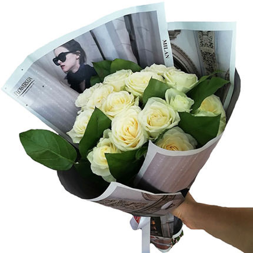 Опис букета: Шикарні білі троянди - найкращий подарунок для справжньої жінки! Склад: 15 білих троянд, висота - до 70 см., зелень оформлення.