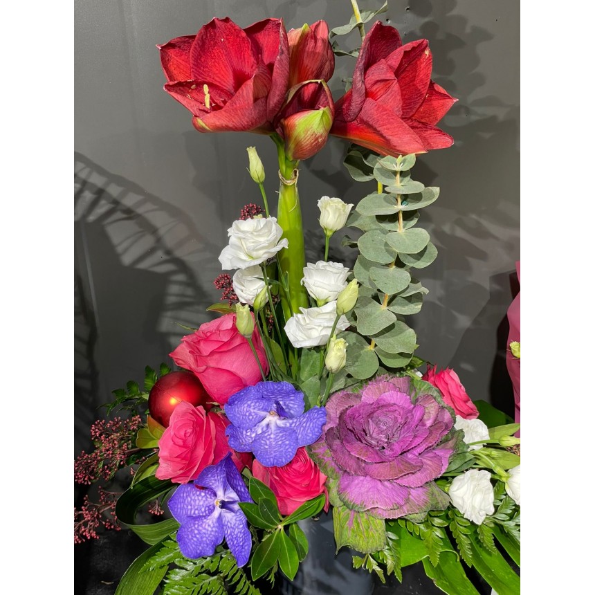 Склад: Еустома, евкаліпт, брасика, Ванда, листя Монстери, троянда Лола, арахніодіс, аспедистра, скімія.