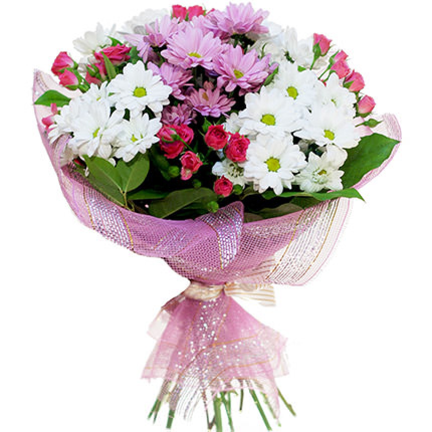 Опис букета: Невимовна ніжність, якій немає меж! Подавши такий букет Ви подаруєте радісні емоції та гарний настрій Вашому одержувачу. Говоріть про кохання романтично – мовою квітів! Склад: 5 гілок білої та рожевої ромашкової хризантеми, 4 гілки кущової троянди, зелень, оформлення.
