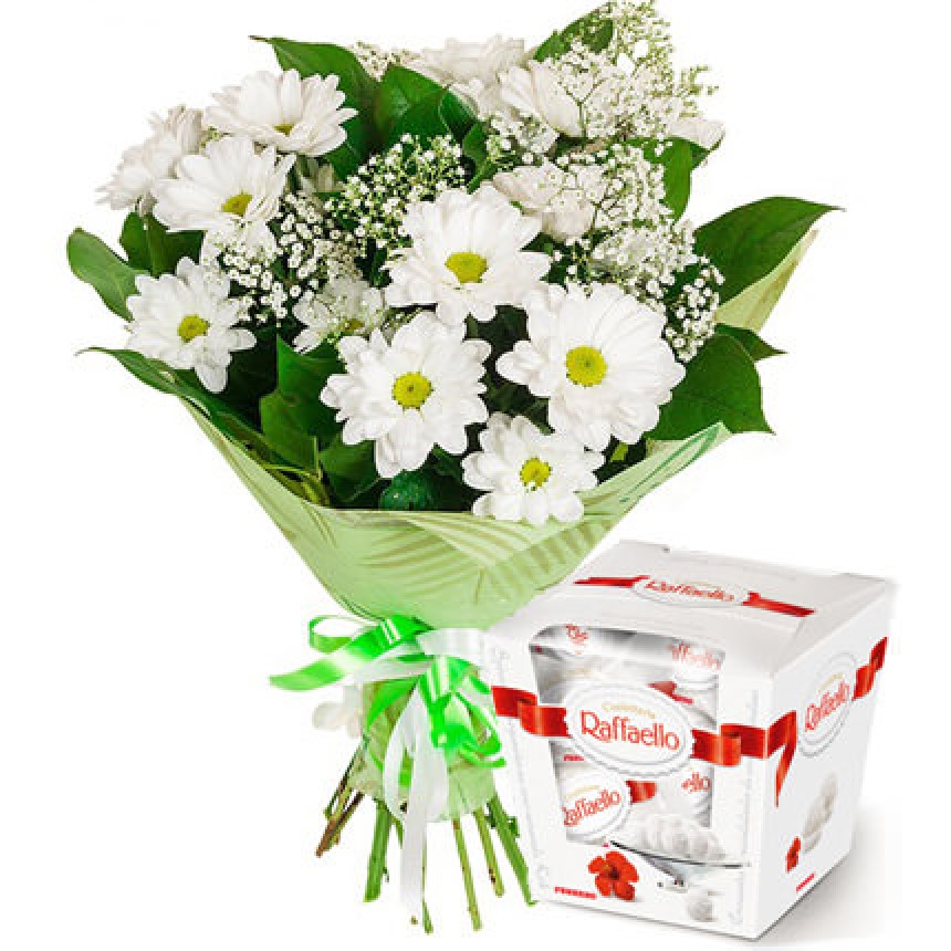 3 гілки білої ромашкової хризантеми, гіпсофілу, зелень, оформлення може відрізнятися, коробка цукерок "Raffaello".